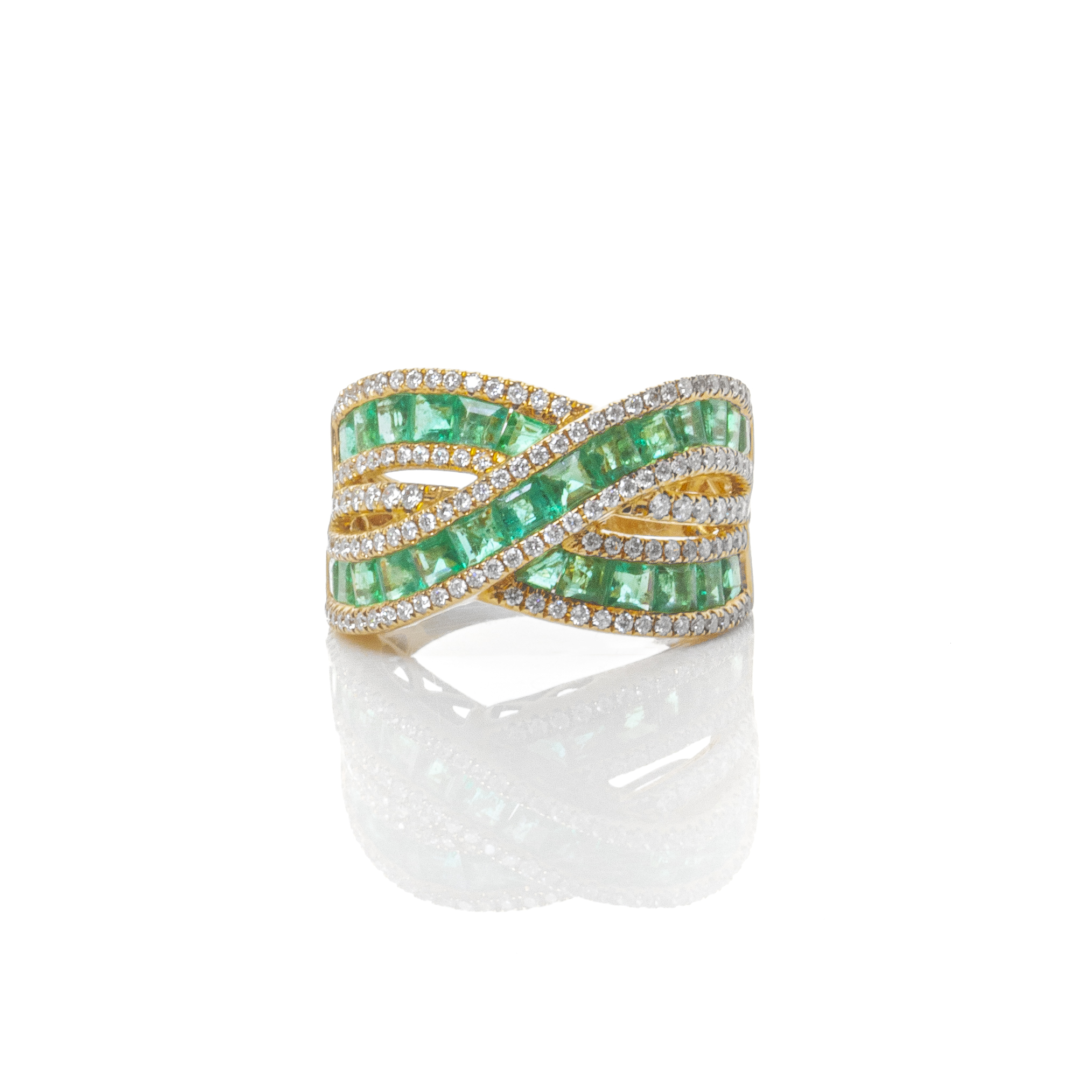 Μοναδικό δαχτυλίδι κατασκευασμένο χειροποίητα από χρυσό 18 καρατίων. Το δαχτυλίδι κοσμείται με τρείς σειρές από μοναδικά baguette κοπής σμαράγδια τα οποία περιμετρικά κοσμούνται από λαμπερά διαμάντια κοπής μπριγιάν. Οι δύο λεπτές διαμαντένιες σειρές βρίσκονται στο κέντρο του δαχτυλιδιού