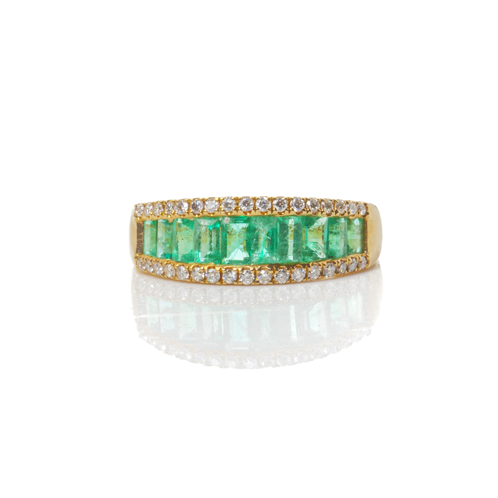 Μοναδικό χειροποίητο δαχτυλίδι κατασκευασμένο από χρυσό 18 καρατίων. Το δαχτυλίδι αυτό κοσμείται από εντυπωσιακά σμαράγδια ορθογώνιας κοπής (baguette cut) που αριστερά και δεξιά στολίζονται από κατάλευκα διαμάντια κοπής μπριγιάν.
