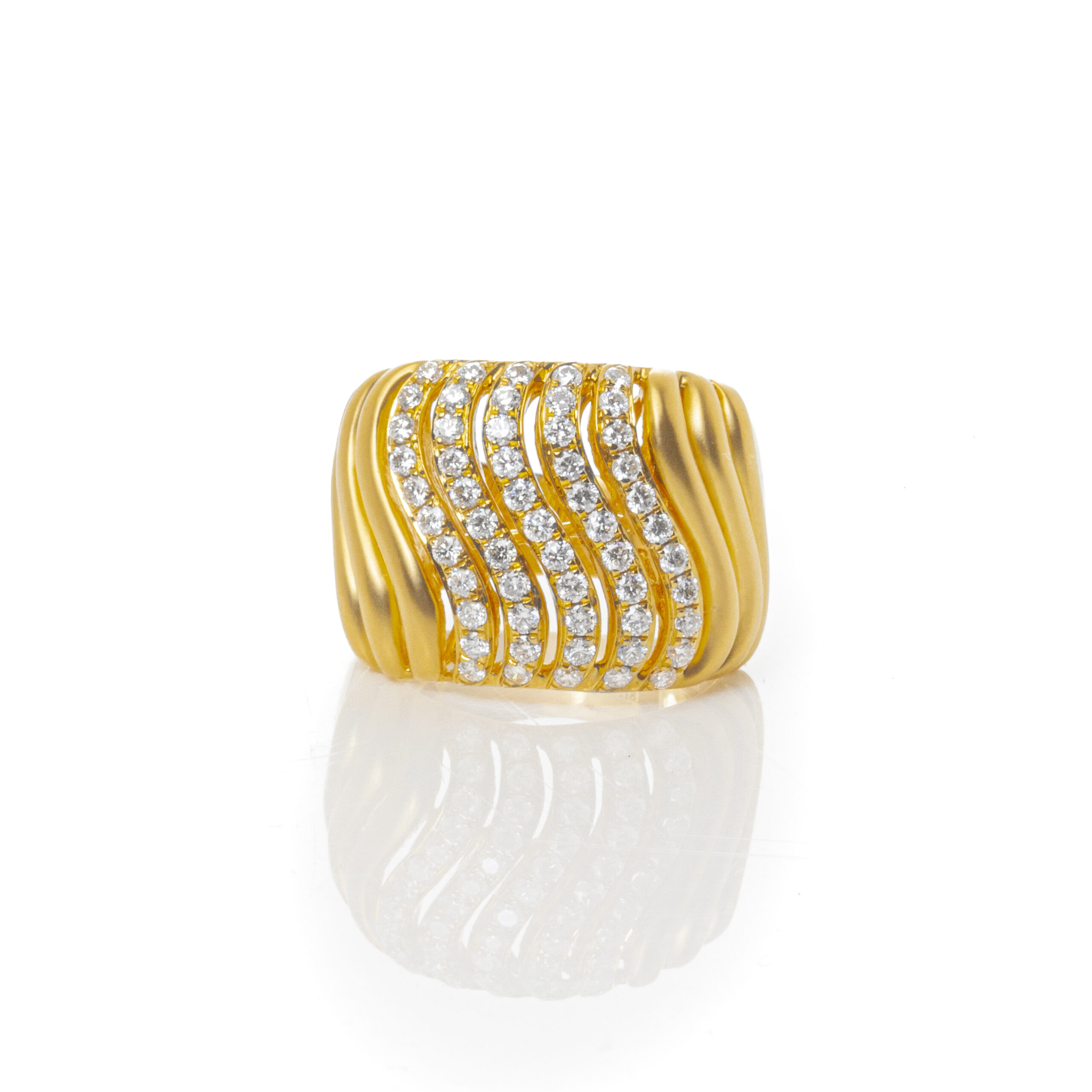 Χειροποίητο φαρδύ δαχτυλίδι κατασκευασμένο από κίτρινο χρυσό 18 καρατίων. Το δαχτυλίδι είναι ματ διάτρητο και αποτελέιται από κυματιστές γραμμές, οι οποίες κοσμούνται από λαμπερά διαμάντια κοπής μπριγιάν
