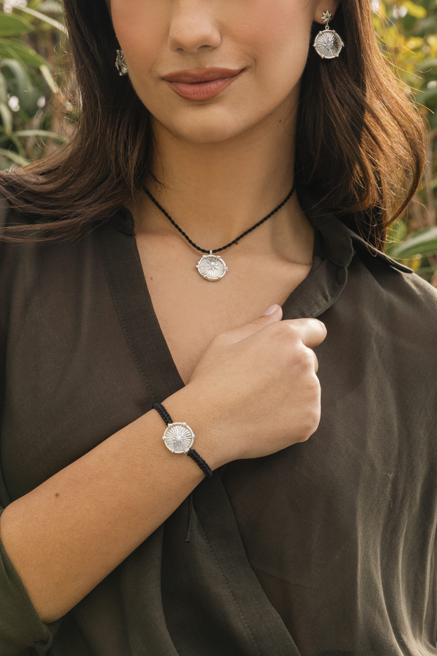 Χειροποίητο μενταγιόν, με μαύρο μεταξωτό κορδόνι κατασκευασμένο από ασήμι 925. Μια στρογγυλεμένη-cabochon πέτρα φίλντισι (mother of pearl) βρίσκεται στο κέντρο των ακτινών. Περιμετρικά η στεφάνη κοσμείται από ευχές για υγεία, αγάπη, τύχη, λάμψη καθώς και από ένα λαμπερό ορυκτό διαμάντι κοπής μπριγιάν