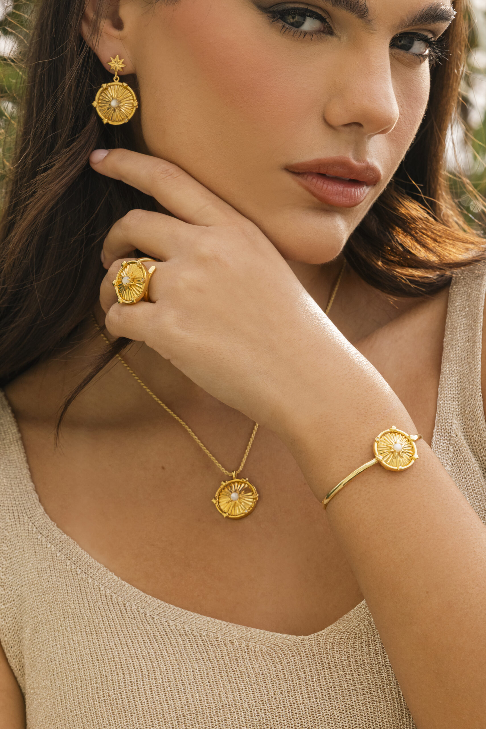 Χειροποίητα κρεμαστά σκουλαρίκια κατασκευασμένα από ασήμι 925, με επιχρύσωμα 18 καρατίων. Στο πάνω μέρος του υπάρχει ένα λαμπερό αστέρι, κάτω από το οποίο κρέμεται το Fos. Μια στρογγυλεμένη-cabochon πέτρα φίλντισι (mother of pearl) βρίσκεται στο κέντρο των ακτινών. Περιμετρικά η στεφάνη κοσμείται από ευχές για υγεία, αγάπη, τύχη, λάμψη καθώς και από ένα λαμπερό ορυκτό διαμάντι κοπής μπριγιάν.