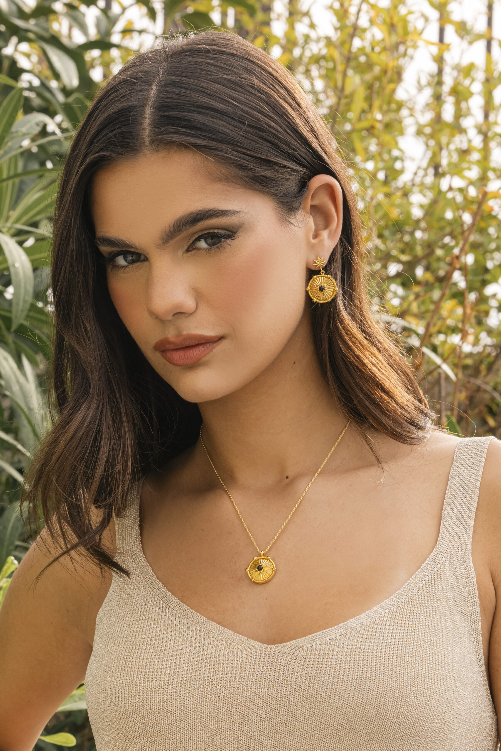 Χειροποίητο μενταγιόν κατασκευασμένο από ασήμι 925 και επιχρύσωμα 18 καρατίων. Μια στρογγυλεμένη-cabochon πέτρα όνυχα βρίσκεται στο κέντρο των ακτινών. Περιμετρικά η στεφάνη κοσμείται από ευχές για υγεία, αγάπη, τύχη, λάμψη καθώς και από ένα λαμπερό ορυκτό διαμάντι κοπής μπριγιάν