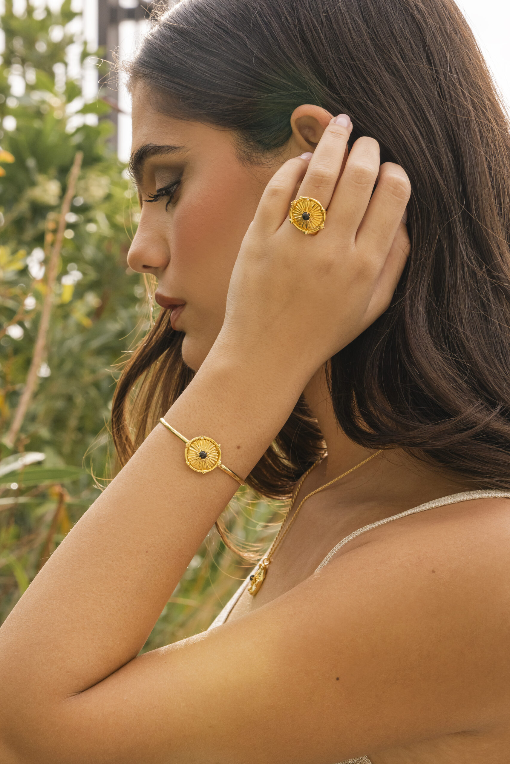 Χειροποίητο βραχιόλι χειροπέδα, κατασκευασμένο από ασήμι 925 και επιχρύσωμα 18 καρατίων. Μια στρογγυλεμένη-cabochon πέτρα από όνυχα βρίσκεται στο κέντρο των ακτινών. Περιμετρικά η στεφάνη κοσμείται από ευχές για υγεία, αγάπη, τύχη, λάμψη καθώς και από ένα λαμπερό ορυκτό διαμάντι κοπής μπριγιάν