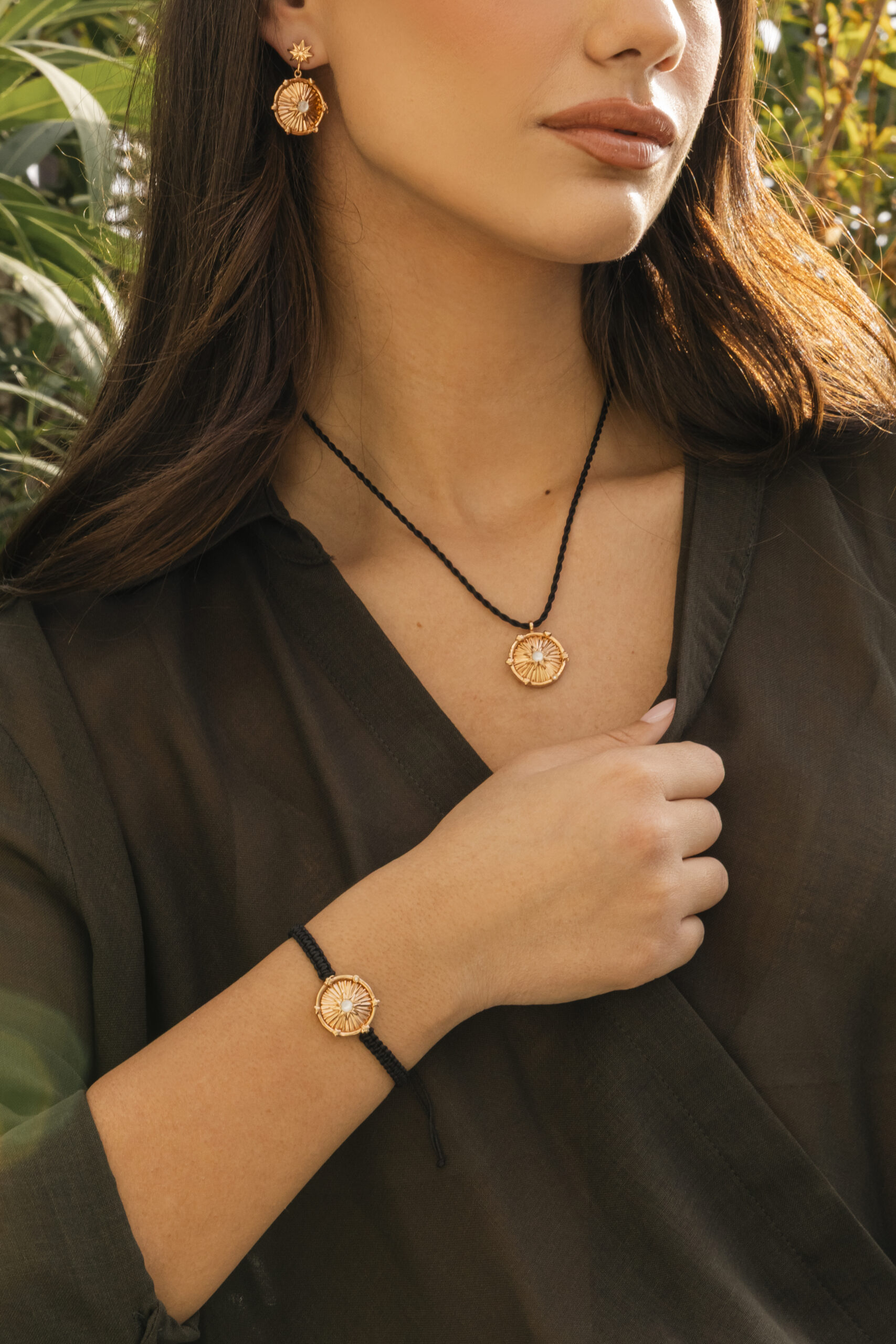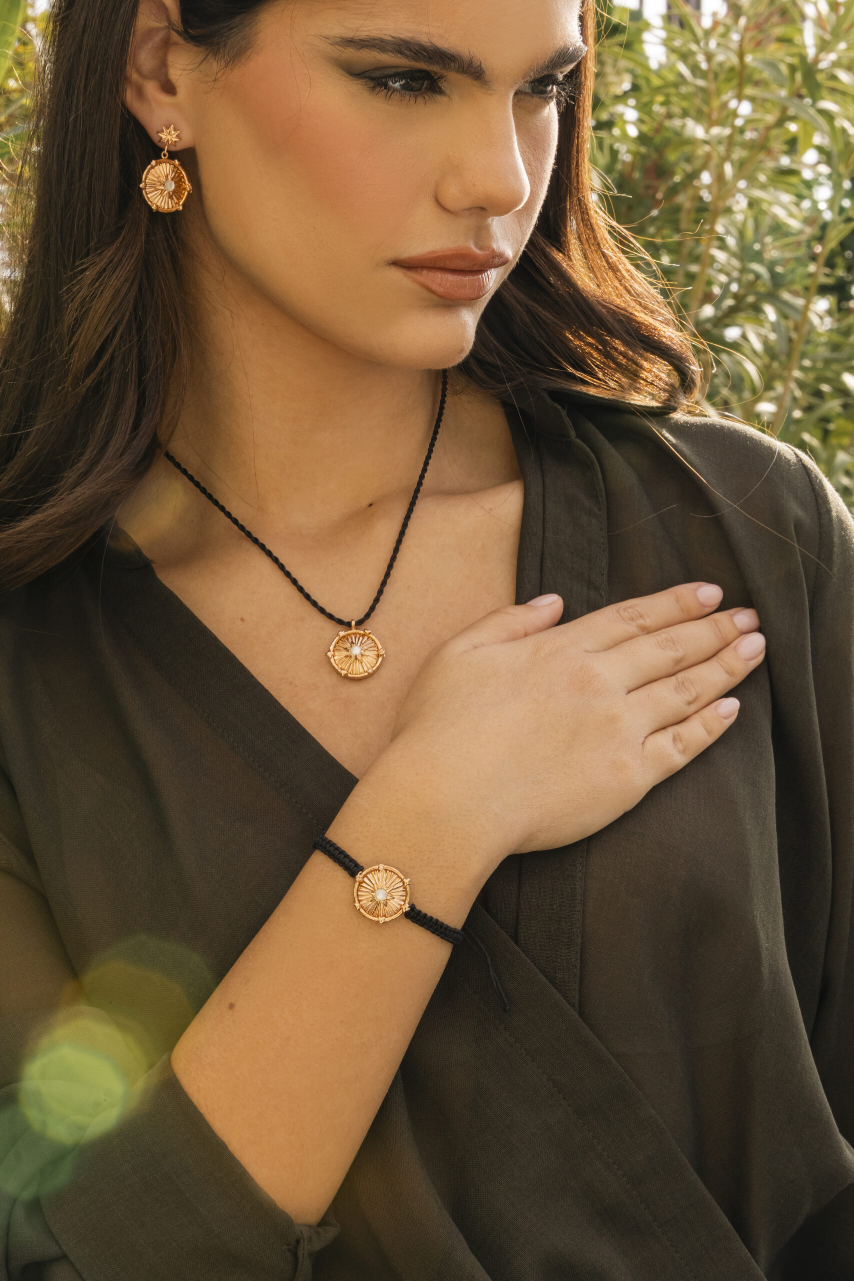 Χειροποίητο μενταγιόν, με μαύρο μεταξωτό κορδόνι κατασκευασμένο από ασήμι 925 και ροζ επιχρύσωμα 18 καρατίων. Μια στρογγυλεμένη-cabochon πέτρα φίλντισι (mother of pearl) βρίσκεται στο κέντρο των ακτινών. Περιμετρικά η στεφάνη κοσμείται από ευχές για υγεία, αγάπη, τύχη, λάμψη καθώς και από ένα λαμπερό ορυκτό διαμάντι κοπής μπριγιάν