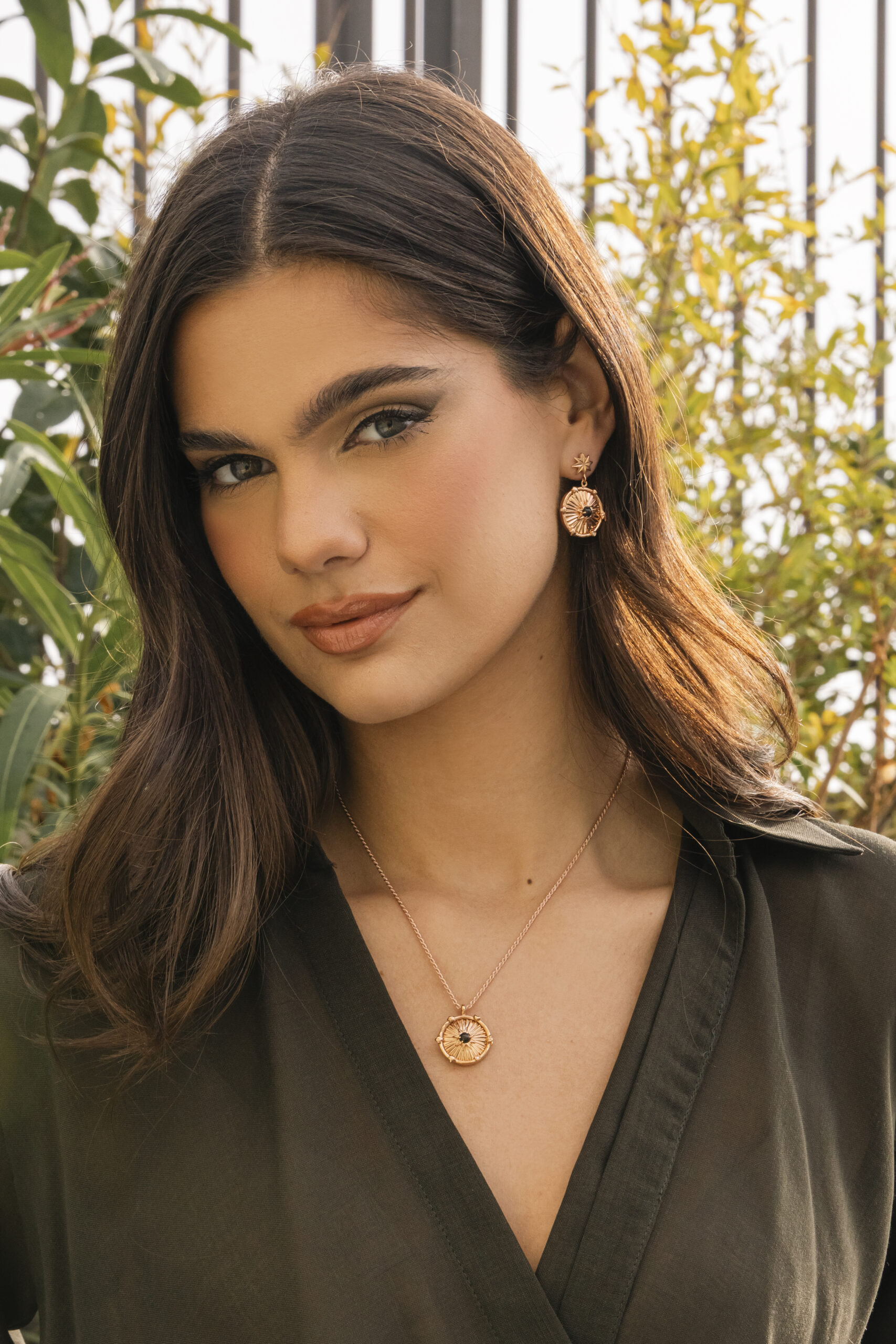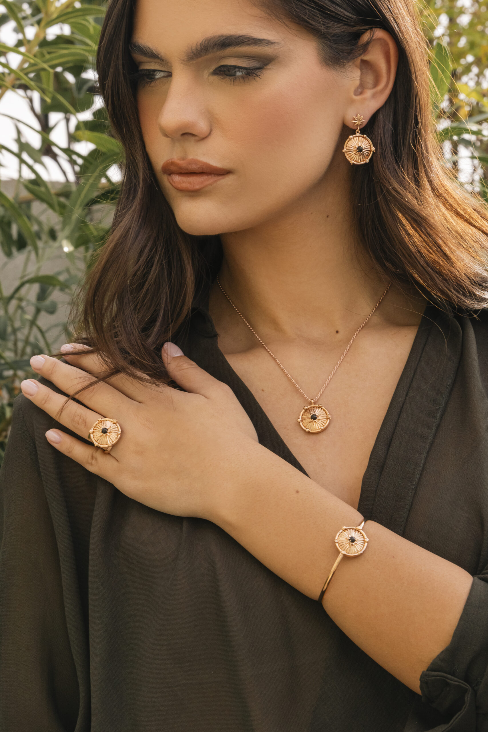 Χειροποίητο μενταγιόν κατασκευασμένο από ασήμι 925 και ροζ επιχρύσωμα 18 καρατίων. Μια στρογγυλεμένη-cabochon πέτρα όνυχα βρίσκεται στο κέντρο των ακτινών. Περιμετρικά η στεφάνη κοσμείται από ευχές για υγεία, αγάπη, τύχη, λάμψη καθώς και από ένα λαμπερό ορυκτό διαμάντι κοπής μπριγιάν