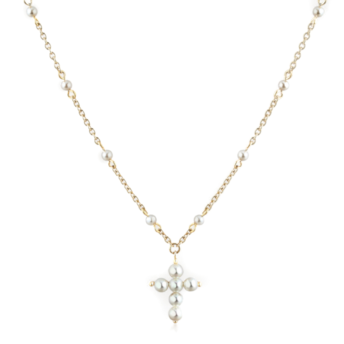 Εντυπωσιακό επίχρυσο κολιέ με αλυσιδά από πέρλες και ένα σταυρουδάκι στο κέντρο με πέρλες