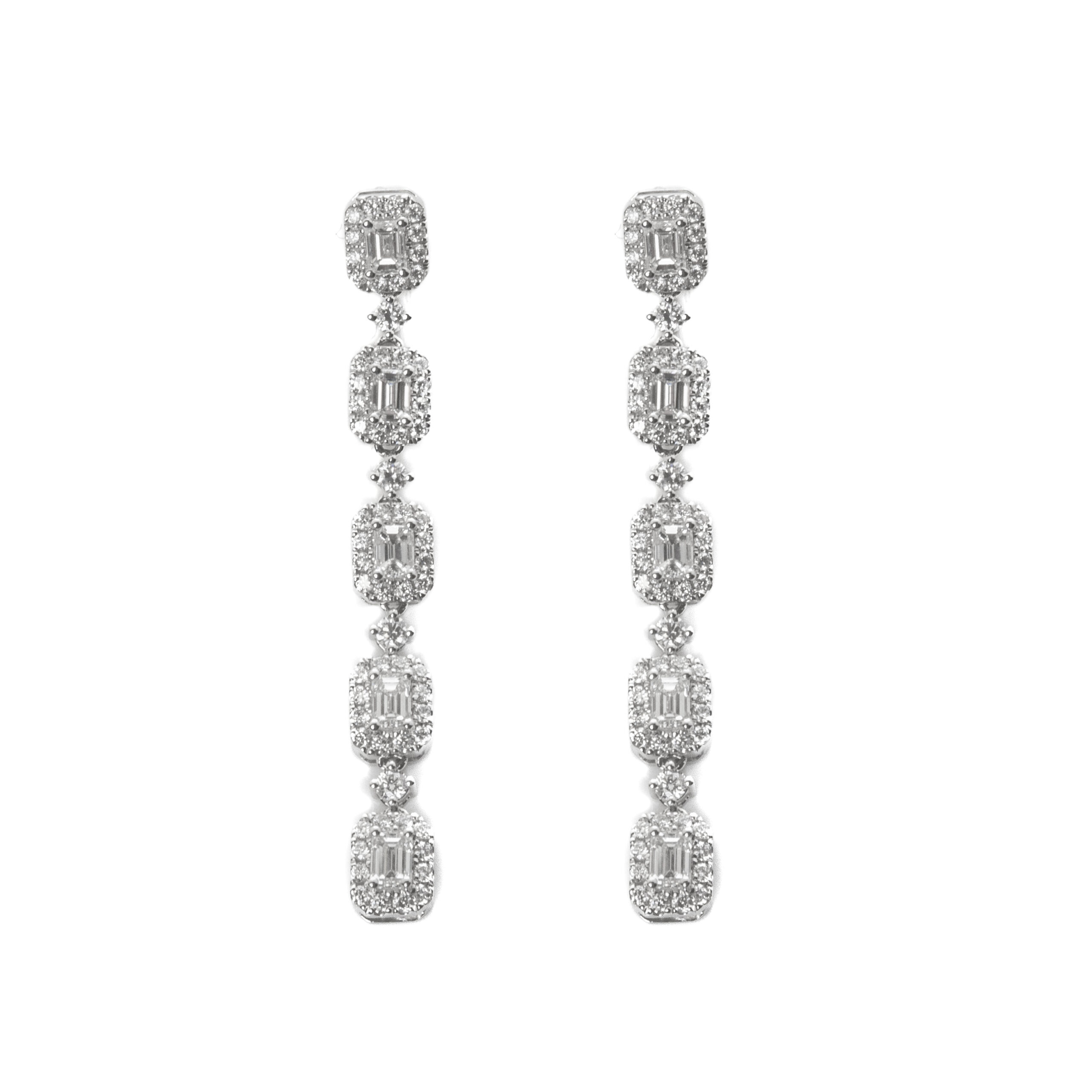 Αστραφτερά κρεμαστά σκουλαρίκια, κατασκευασμένα από λευκόχρυσο 18 καρατίων. Κάθε σκουλαρίκι αποτελείται από πέντε ορθογώνιες ροζέτες οι οποίες κοσμούνται από κατάλευκα διαμάντια κοπής μπριγιάν και baguette. Η σύνδεση των ροζετών γίνεται με αστραυτερά μπριγιάν. Τα σκουλαρίκα έχουν υπέροχη κίνηση, είναι πολύ διαχρονικά και ιδανικά για ιδιαιτέρες εμφανίσεις