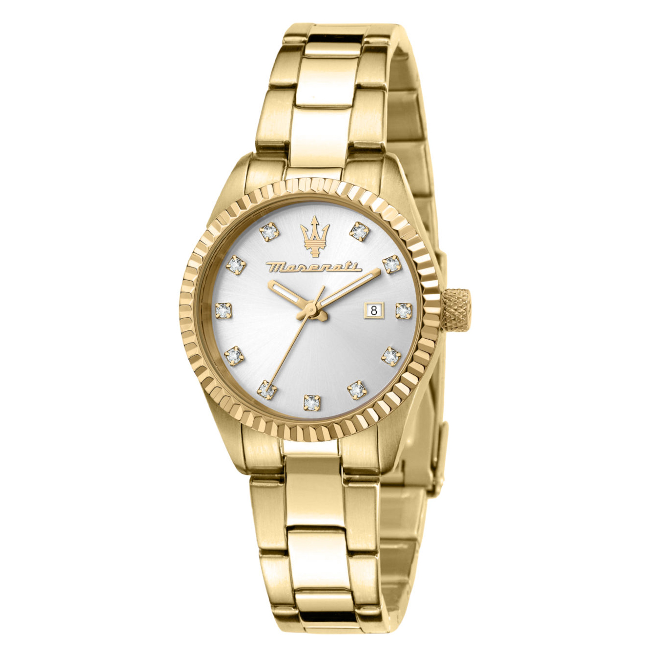 Γυναικείο ρολόι Maserati διαμέτρου 31mm, με μηχανισμό Quartz ακριβείας. Έχει ασημί καντράν με επιχρυσους δείκτες και λεπτομέρειες, κρύσταλλο από ορυκτό κρύσταλλο ειδικής σκλήρυνσης. Έχει μπρασελέ από ανοξείδωτο ατσάλι με κίτρινο επιχρύσωμα και κούμπωμα ασφαλείας
