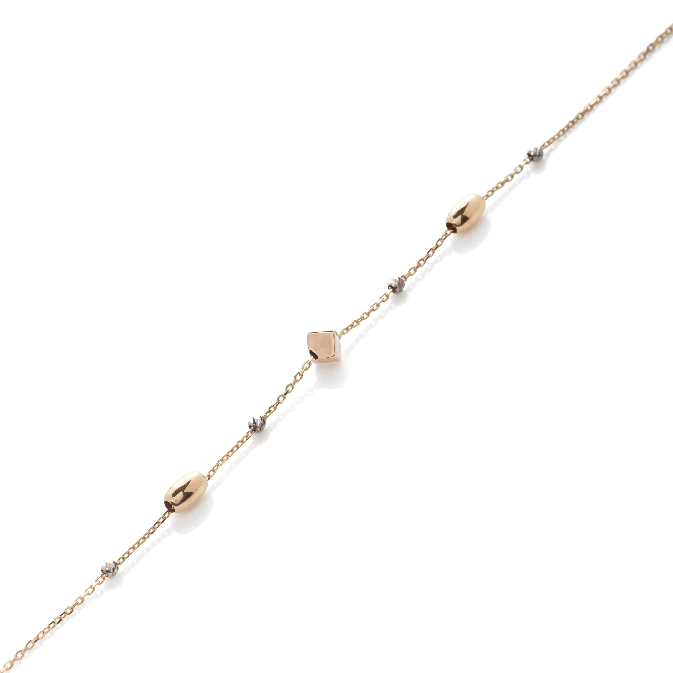 Χειροποίητο βραχιόλι με αλυσίδα, με τα τρία χρώματα του χρυσού, κατασκευασμένο από χρυσό 14 καρατίων. Η αλυσίδα του βραχιολιού είναι από κίτρινο χρυσό. Οι κύβοι οι οποίοι την διαπερνούν είναι από ροζ χρυσό, οι μπίλιες είναι λευκόχρυσες με ειδική επεξεργασία και οι κύλινδροι χρυσοί γυαλιστεροί.